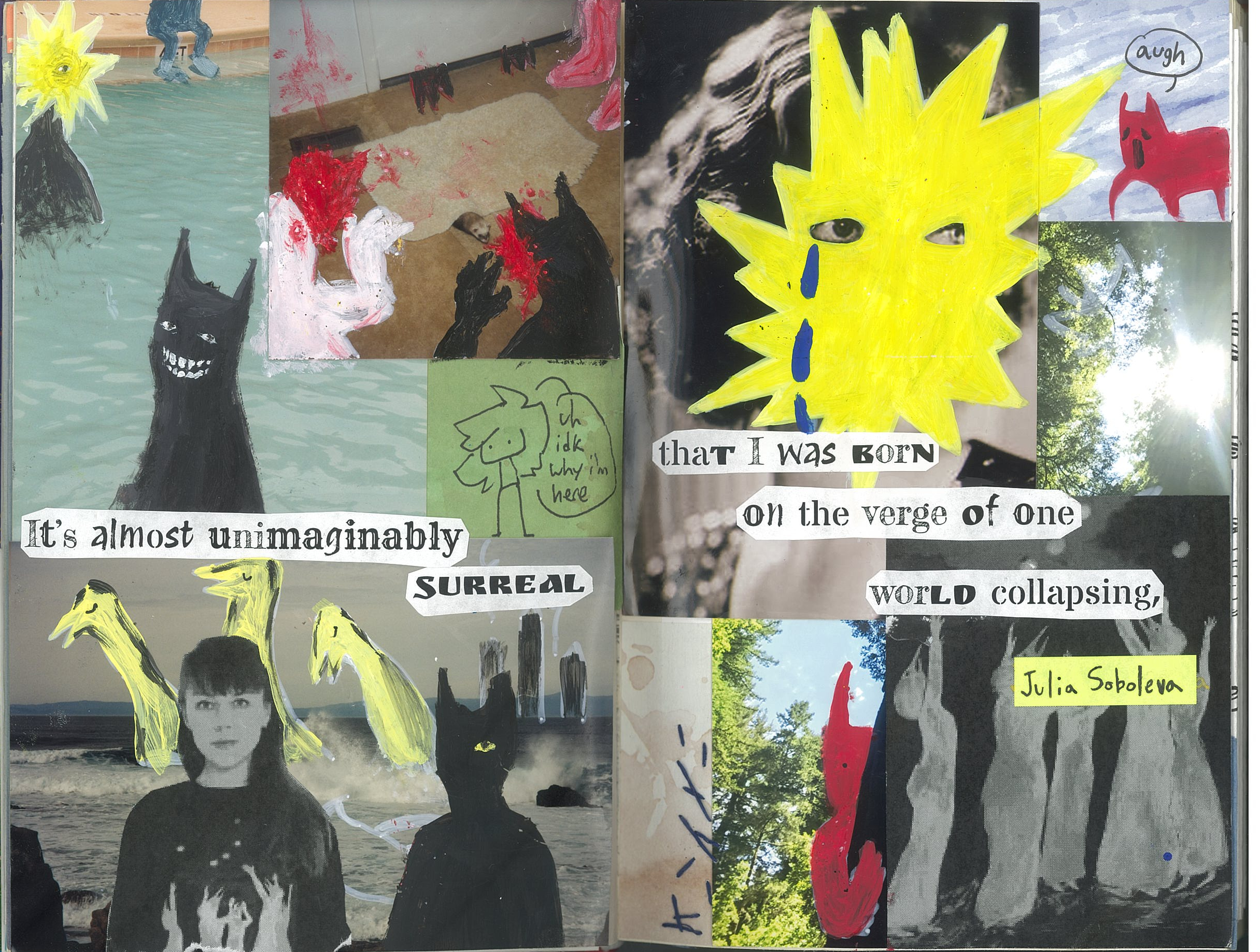 This is kinda the first time I tried to actually paint on top of any photos I have (how was that the case idk) because I usually glue things on top of it. I was scared I wasn't gonna catpure the kind of emotion Soboleva has in her works but I think I did the best I could. I had like two days to do everything and that included waiting for most of the things to be printed anyways. I still think I did a really good job though `,:] The quote in the middle is from her interview about her collection of paintings "I Found The Light In The Darkness" and it really resonated with me because yeah, I am living up on the verge of a world collapsing and it's terrifying and unknown. I really want to go see her art in person, that's on my bucket list