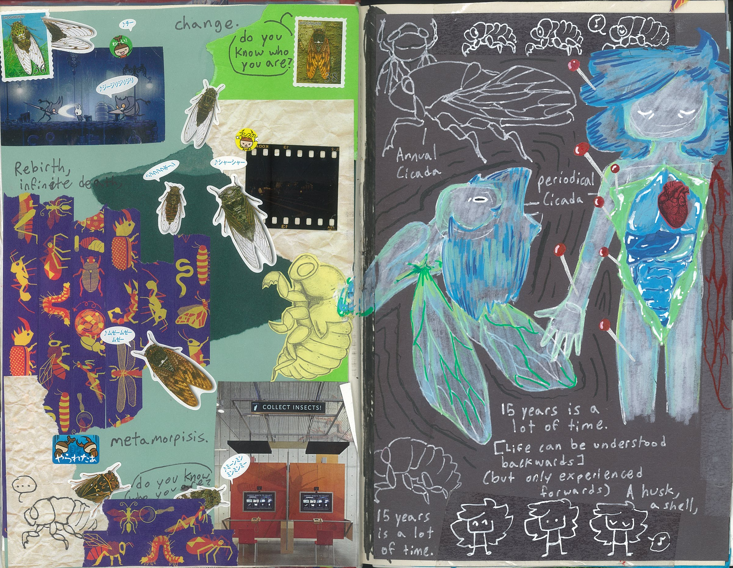 I used a ton of scrap paper for the background because I need to cover the middle seam, and my brother had these bug stickers so I used a ton of the cicada ones. And more magazine scraps from the library!! Yay :) And for the right side, I used these (lowkey kinda shitty) paint markers in order to portray the freshly-shed cicada skin for my sona. Some random white and red markers and like boom it's done. I really like this one because it's very jarring despite what it's portraying, like, portraying the fear of growing and the future in its most apparent and brutal form. Or something like that. I'm not a poet.