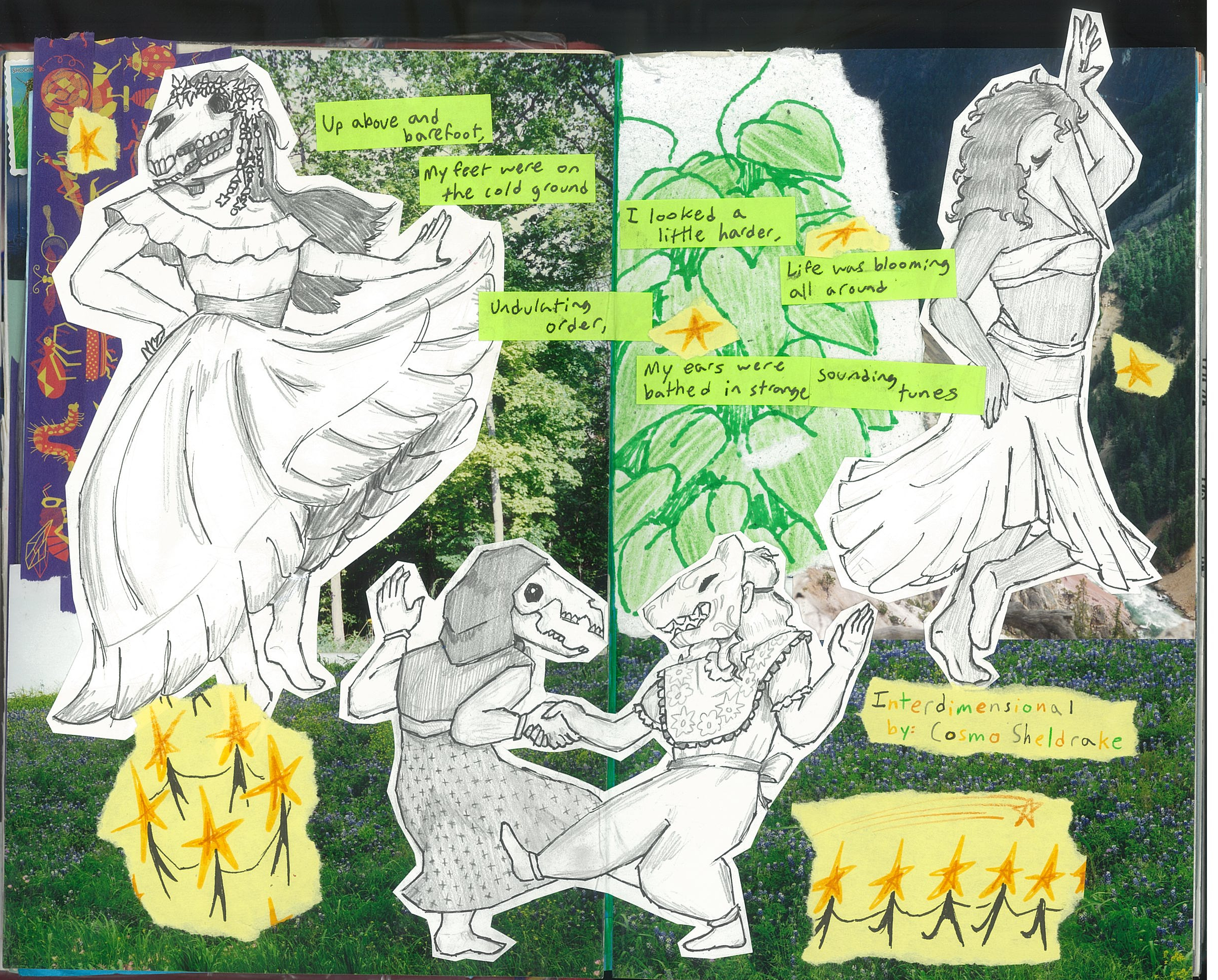 The background is mostly comprised of old photographs I got from this art thriftstore close to my house I've been hoarding for a long time. The plants in the middle are solely there in order to fill in empty space cus I didn't want to waste another photo. The figures were cut out from a seperate sketchbook and are really roughly sketched and lined but I feel like that adds to the very natural movement of the song itself. (That you should totally listen to by the way because Cosmo Sheldrake is awesome!!!! please please please pleas) The little star guys and the lyrics are cut out from sticky notes cus I was running out of time and ideas on how to spice it up. But even though it's not as decorated as some other spreads, it came out really good. I love music so much bro