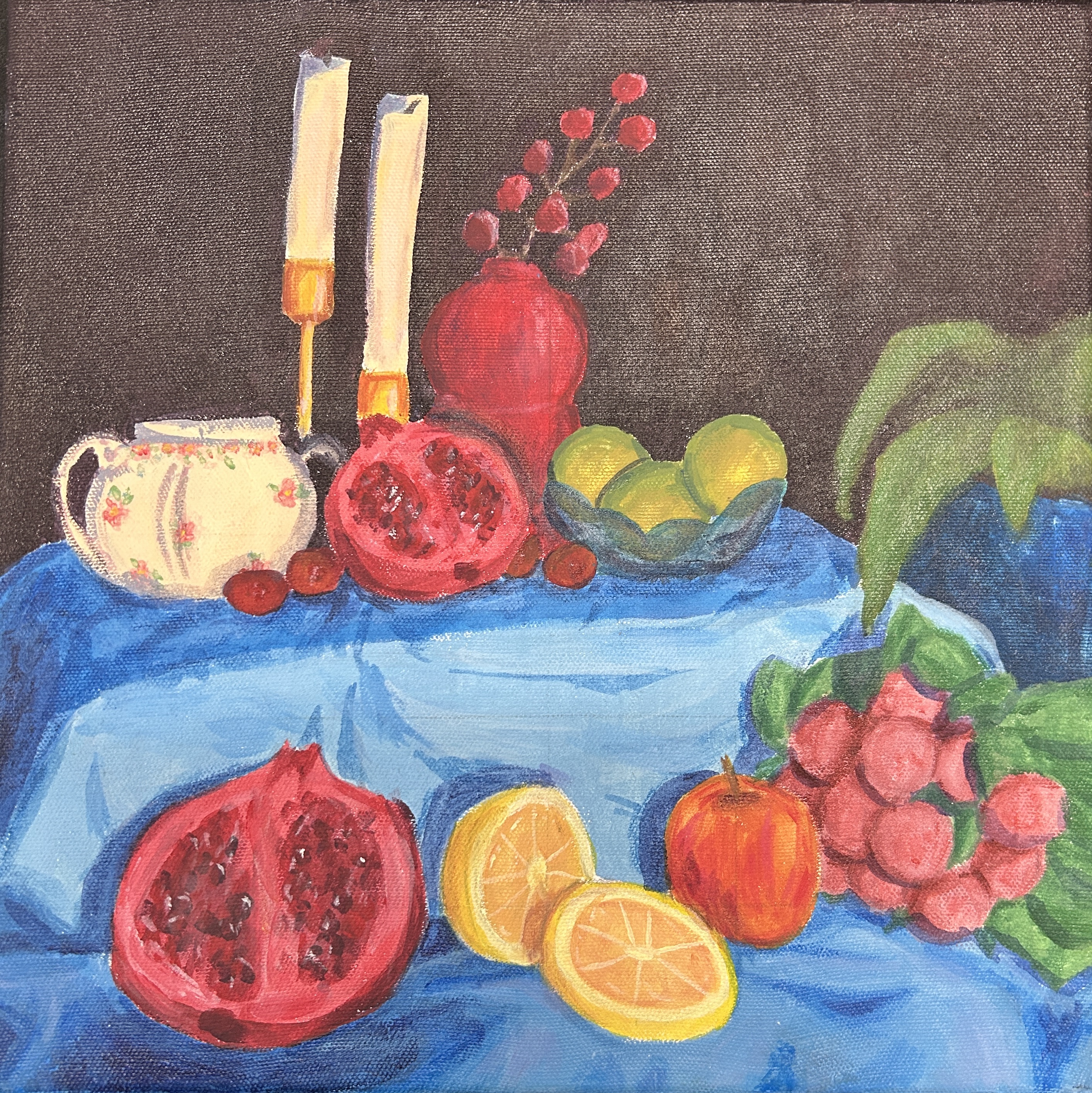 I was pretty nervous starting this project actually because I had never done a still life before and I was really concerned with making it as realistic as I could. And then I realized....I really don't give a fuck...I can do whatever I want....and so I made it more contrasting and brighter cus previously I had used really muddy colors. I think I did really good though! Painting the fabric is what got to me ughhhh I hated painting the stupid fabric >:[ I really like dis one tho