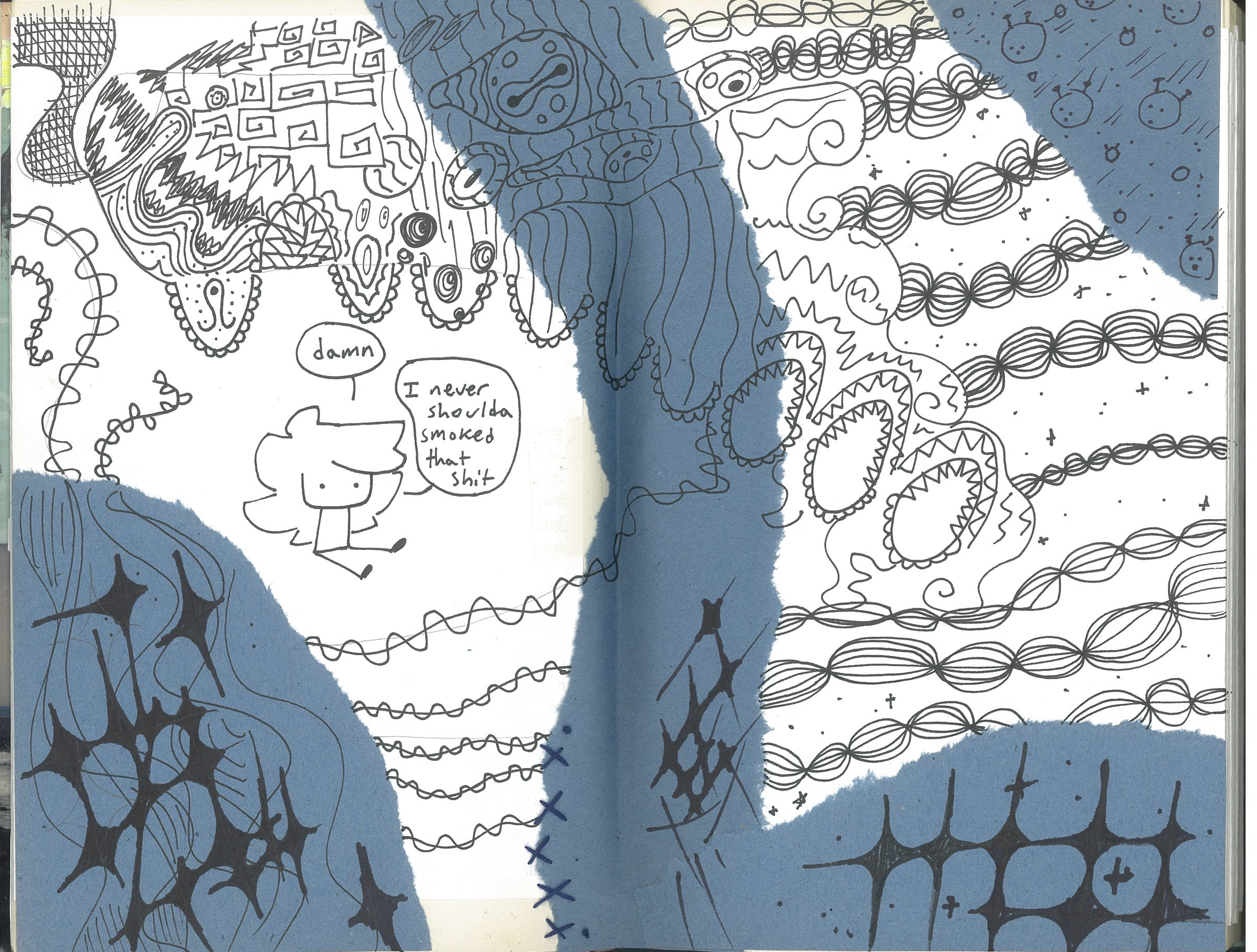I kinda zoned out while making it. There's a bunch of random stuff on it like the washi tape I got from New Mexico (long story) and the chorus lyrics from Once In A Lifetime by The Talking Heads. The 'guns' on the top of the cover are magazine cut outs that are actually a bunch of camera equipment and there's supposed to be something reading "Information is ammunition" but i think it somehow rippped or something. Damn. Those figures on the top and bottom are kinda meant to be me but it's very loosely based. It's kinda just more for random symbolic meaning but it really doesn't matter. It's whatever. :p